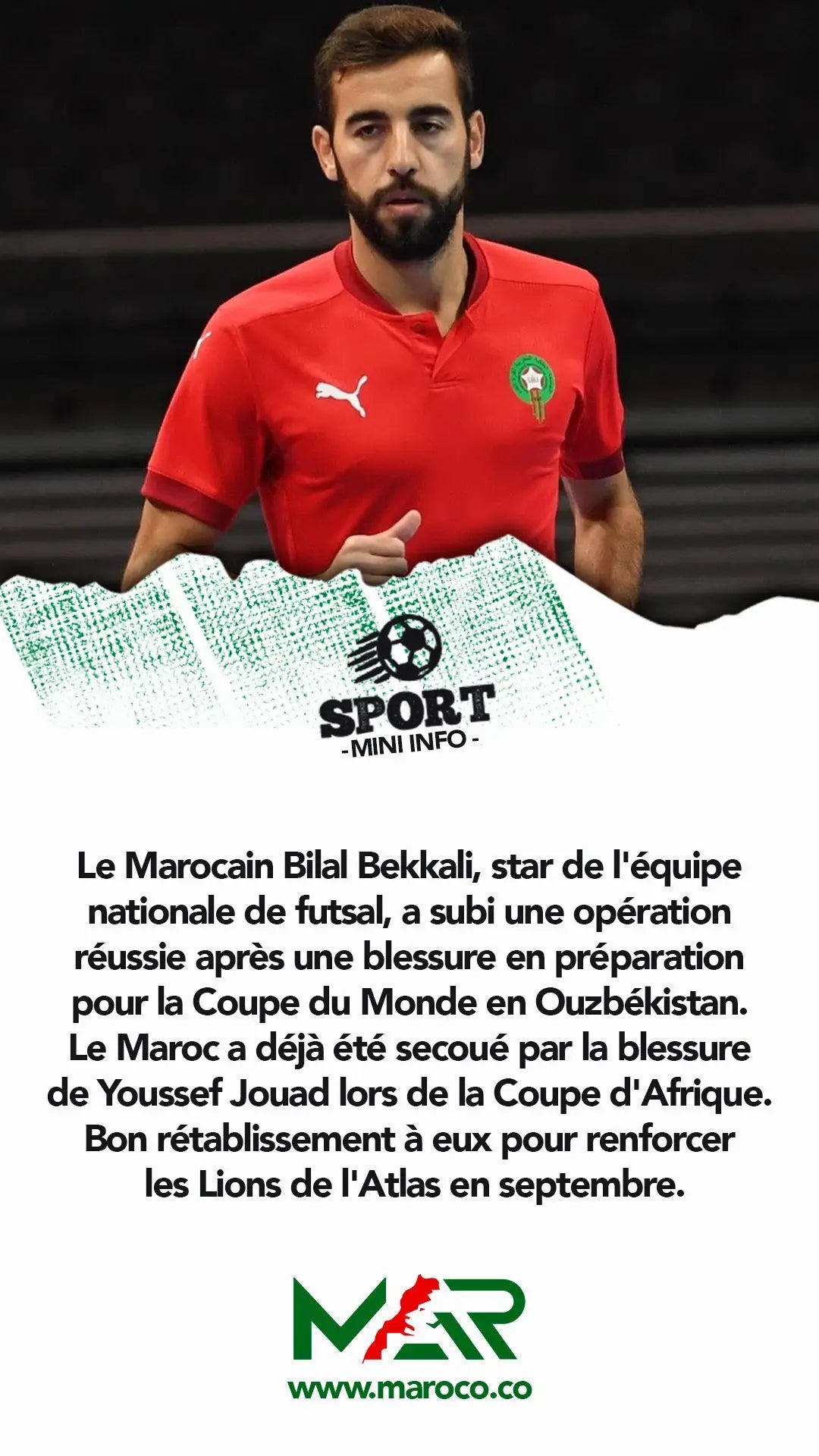 Le Marocain Bilal Bekkali, star de l'équipe nationale de futsal, a subi une opération réussie après une blessure en préparation pour la Coupe du Monde en Ouzbékistan.