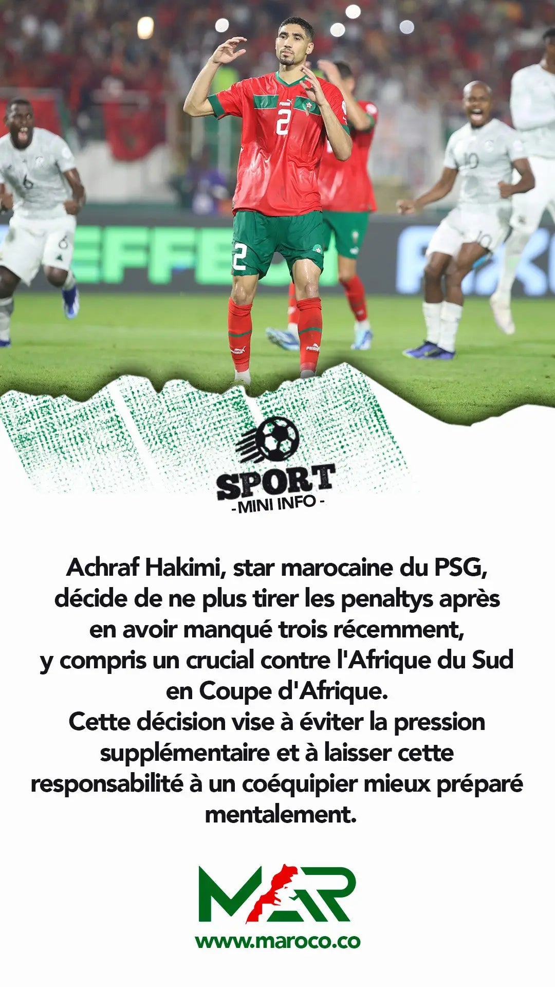 Achraf Hakimi, star marocaine du PSG, décide de ne plus tirer les penaltys après en avoir manqué trois récemment, y compris un crucial contre l'Afrique du Sud en Coupe d'Afrique.