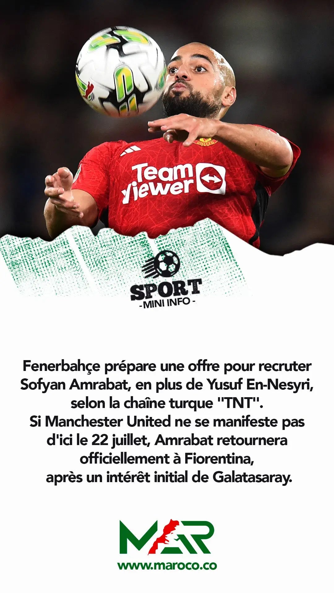 Fenerbahçe prépare une offre pour recruter Sofyan Amrabat, en plus de Yusuf En-Nesyri, selon la chaîne turque "TNT". Si Manchester United ne se manifeste pas d'ici le 22 juillet, Amrabat retournera officiellement à la Fiorentina.
