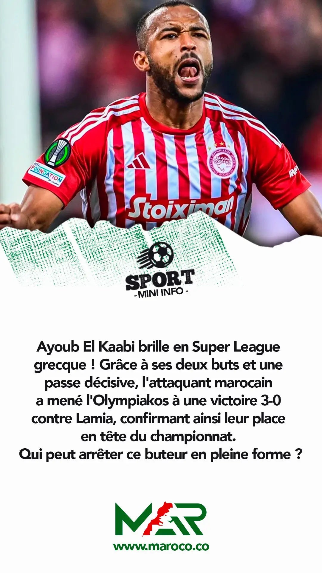 Ayoub El Kaabi brille en Super League grecque ! Grâce à ses deux buts et une passe décisive, l'attaquant marocain a mené l'Olympiakos à une victoire 3-0 contre Lamia..