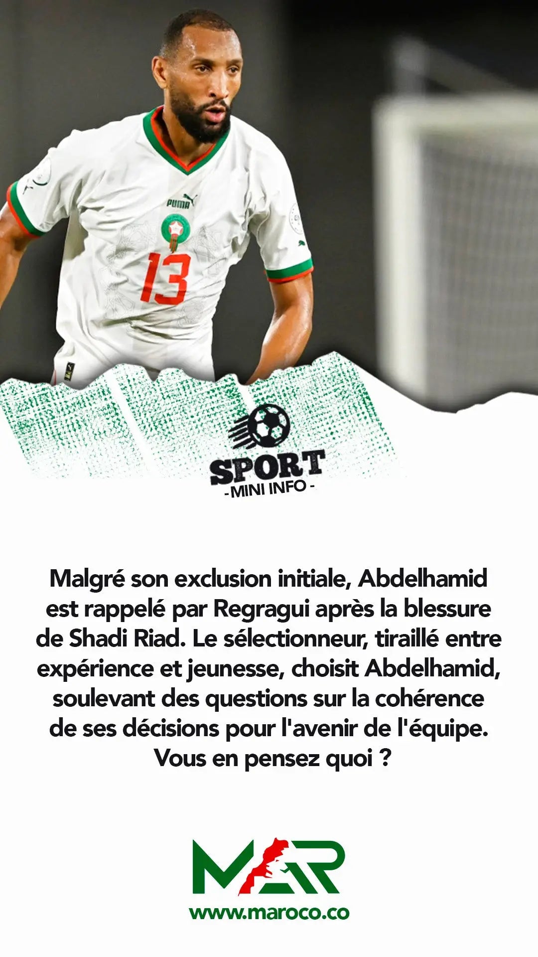 Malgré son exclusion initiale, Abdelhamid est rappelé par Regragui après la blessure de Shadi Riad. Le sélectionneur, tiraillé entre expérience et jeunesse, choisit Abdelhamid..