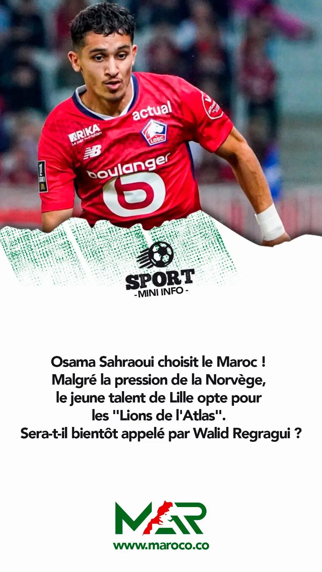 Osama Sahraoui choisit le Maroc ! Malgré la pression de la Norvège, le jeune talent de Lille opte pour les "Lions de l'Atlas". Sera-t-il bientôt appelé par Walid Regragui ?