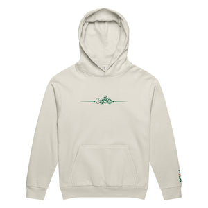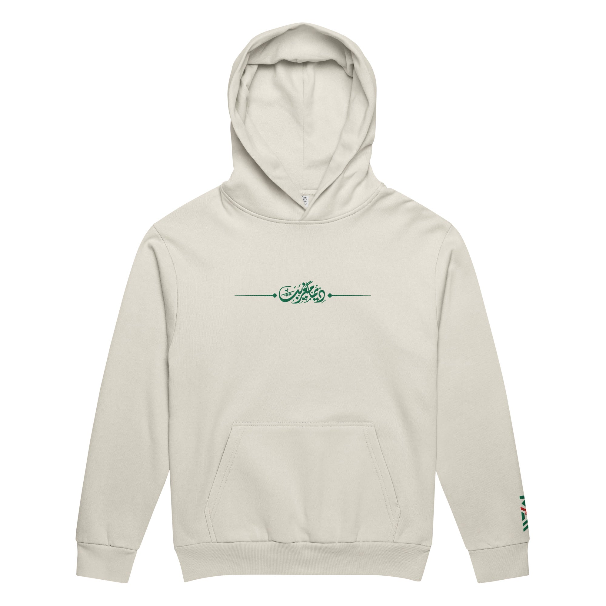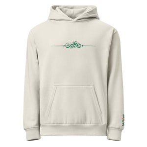 La broderie “Dima Maghrib”, placée au centre de la poitrine, s’exprime avec discrétion et précision. Elle ne cherche pas à dominer la pièce mais à l’ancrer. Le vert profond, symbole d’espoir, de continuité et d’héritage, contraste parfaitement avec la teinte claire du sweat pour un rendu élégant, moderne et urbain. C’est une déclaration subtile, comprise par ceux qui savent.