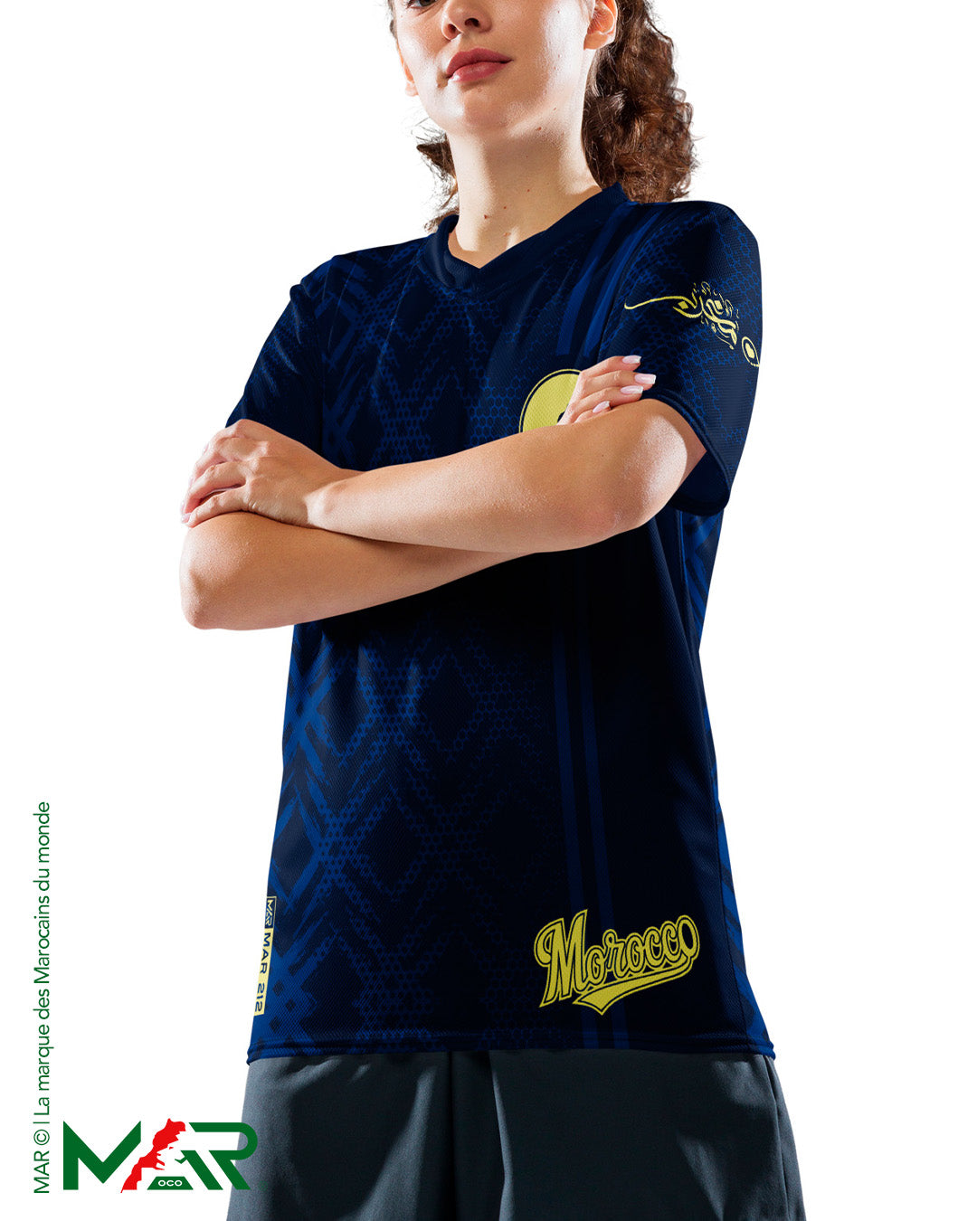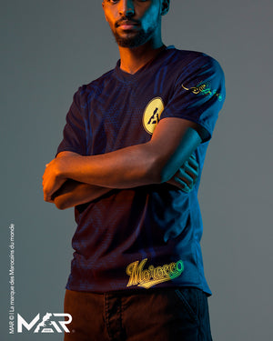 Affiche ton soutien aux Lions de l’Atlas avec ce maillot unisexe unique, pensé pour la CAN 2025. Son bleu nuit intense sublimé par des motifs traditionnels et des touches dorées modernes incarne l’union entre culture marocaine et passion footballistique. Le logo stylisé et l’inscription "Morocco" donnent à ce maillot une allure audacieuse et affirmée. Pour les vrais fans qui vibrent au rythme du bled.