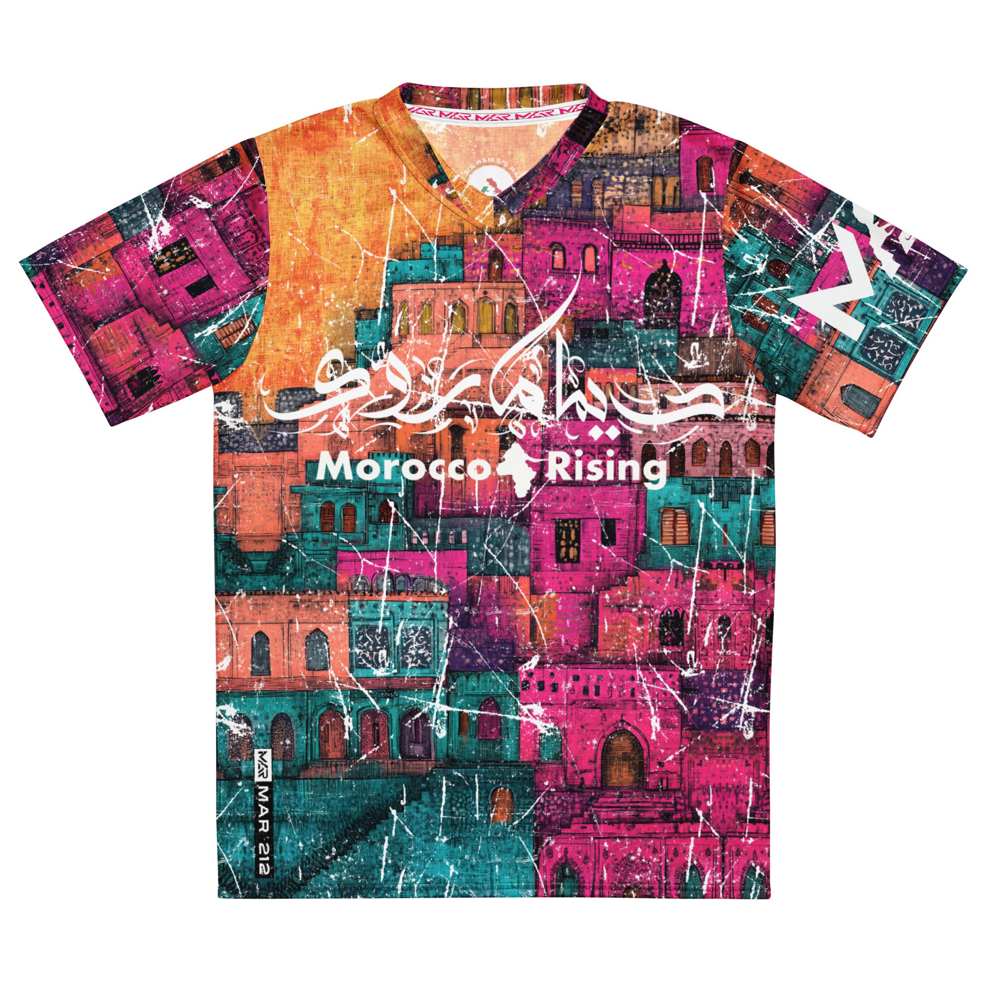 Aux teintes magenta, turquoise et orange, il affiche fièrement la calligraphie "مستمرين في الصعود" (Nous continuons à nous élever) et le slogan Morocco Rising.