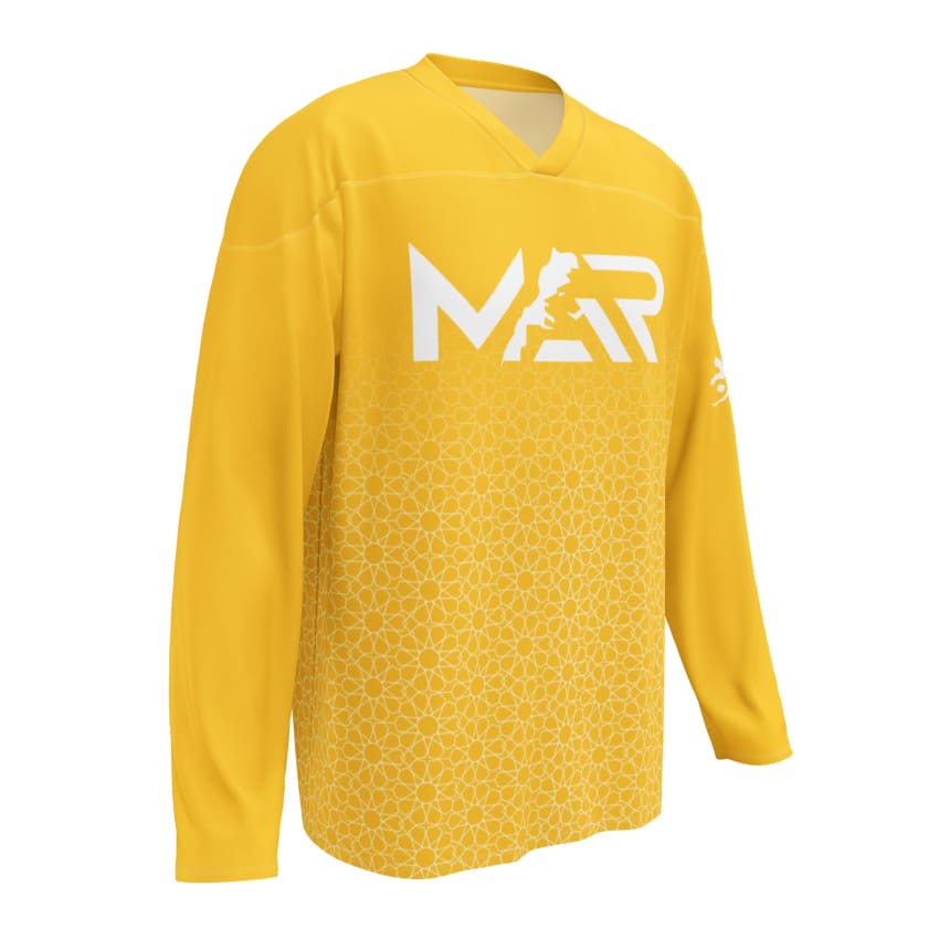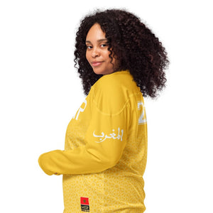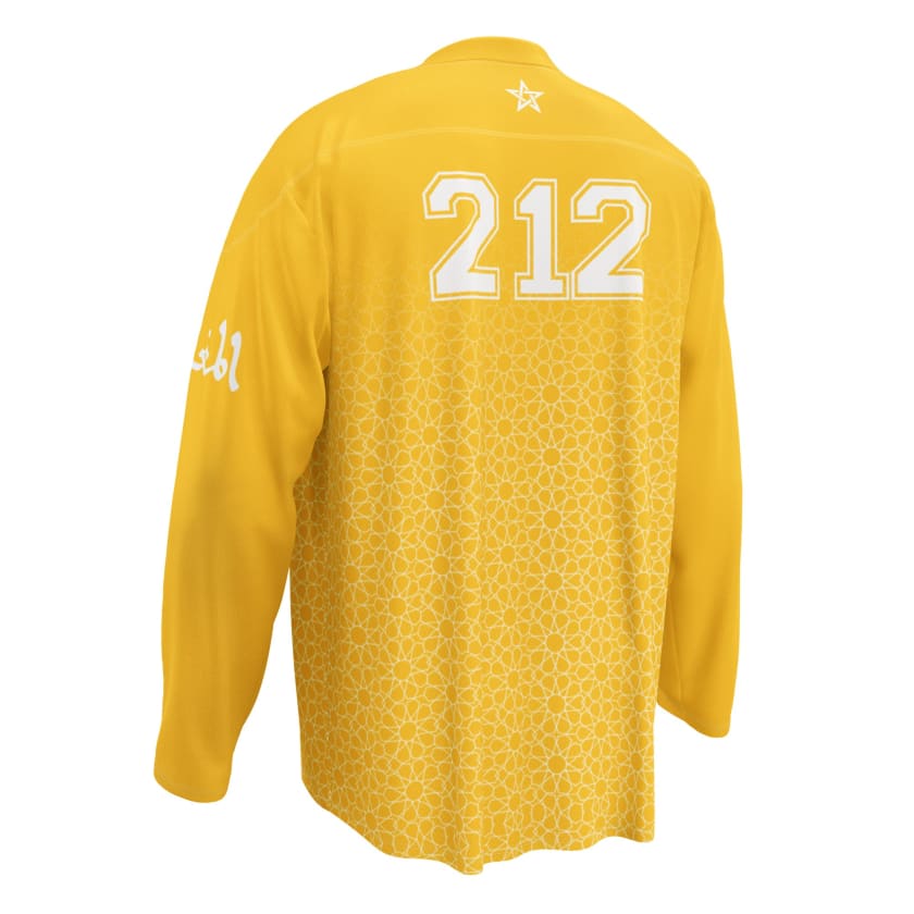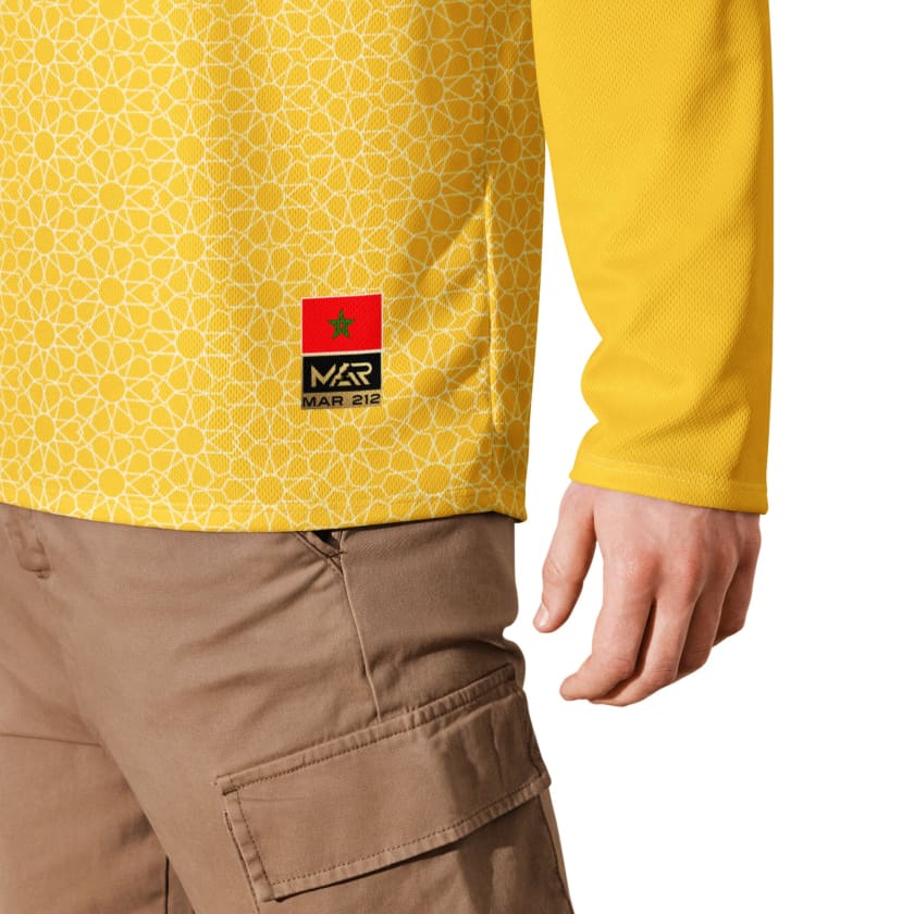 Ce maillot de foot manche longue MAROC jaune est parfait pour les fans de football. Fabriqué avec soin et une structure spécifique de style hockey, il offre une expérience authentique et confortable. Supportez votre équipe avec style !