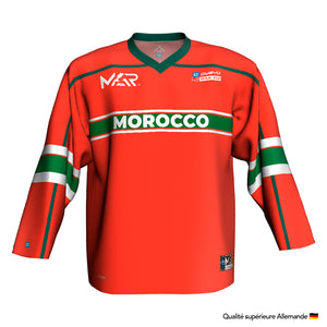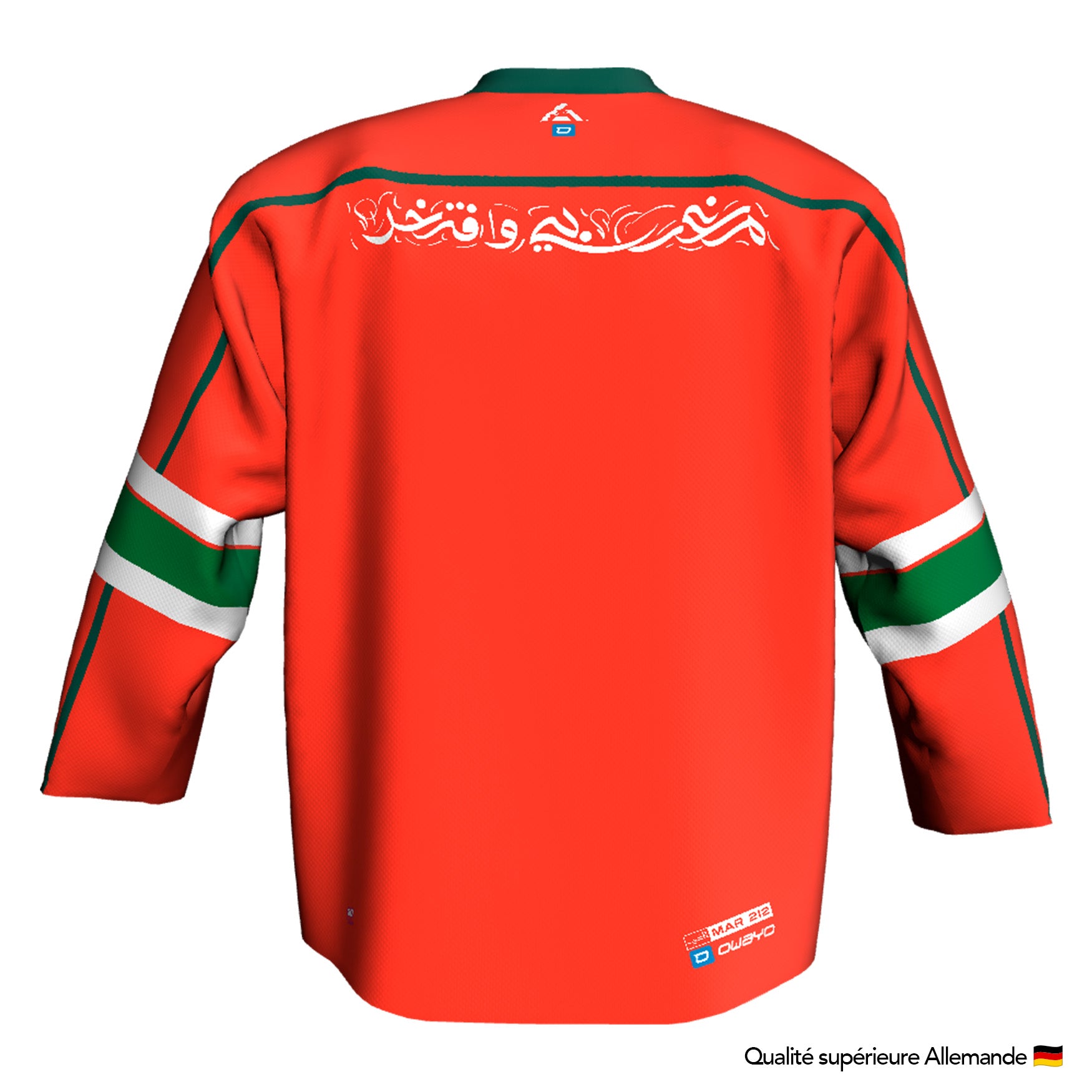 Le PRIDE MOROCCO est un maillot de hockey haut de gamme, pensé pour allier performance sportive et identité marocaine. Son rouge intense, renforcé par des bandes blanches et vertes, met en avant un design audacieux où le lion rugissant et l’inscription Morocco sont brodés en patchs premium.