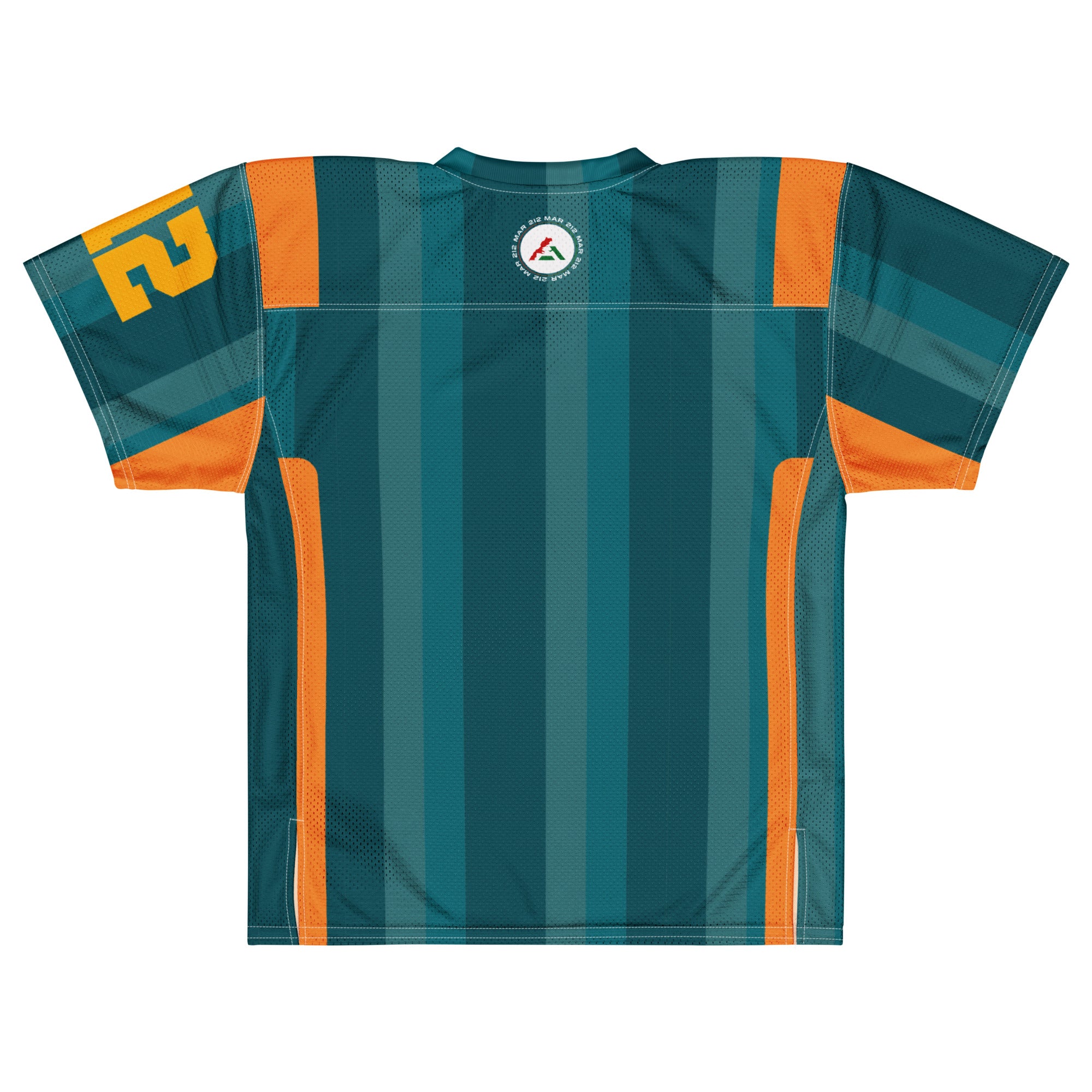 Ce jersey vert intense à bandes subtiles, rehaussé de touches orange doré, s’impose comme une pièce de caractère.