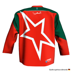 Son design audacieux met en avant une étoile géante aux couleurs du Maroc, symbole de lumière et d’unité, qui transforme ce maillot en véritable manifeste de style.
