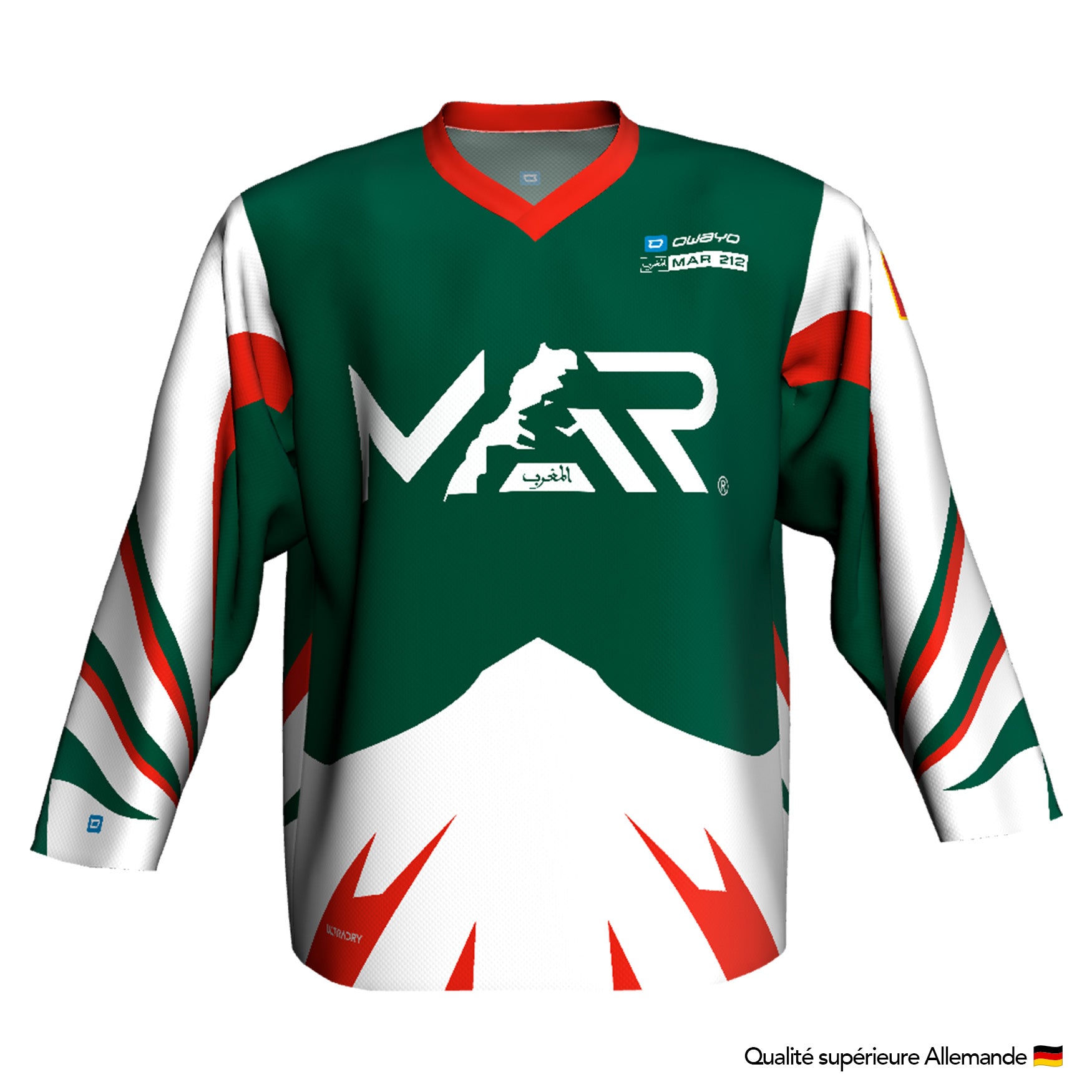 Un maillot qui fusionne technicité sportive et héritage marocain, pensé pour briller sur la glace comme dans la rue.