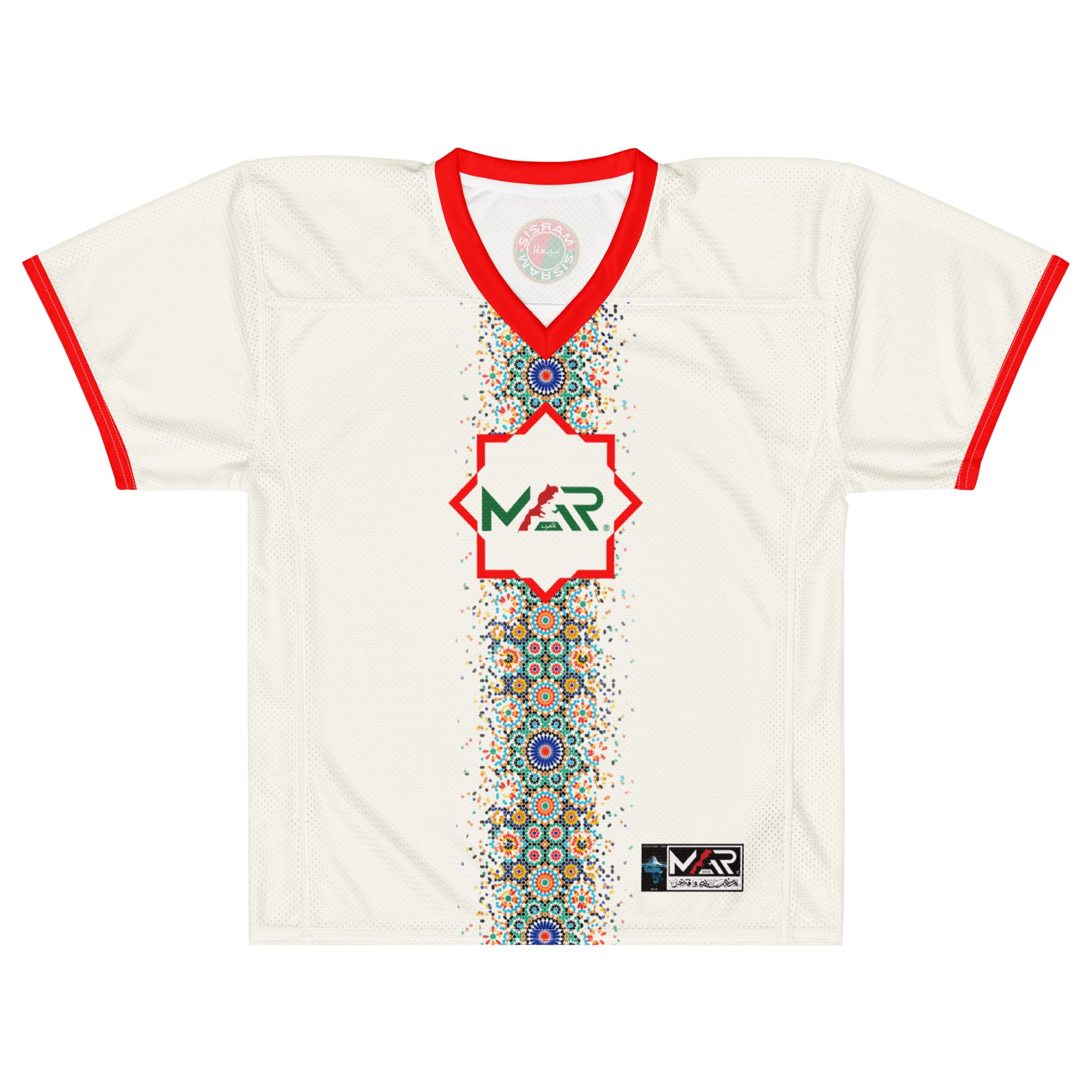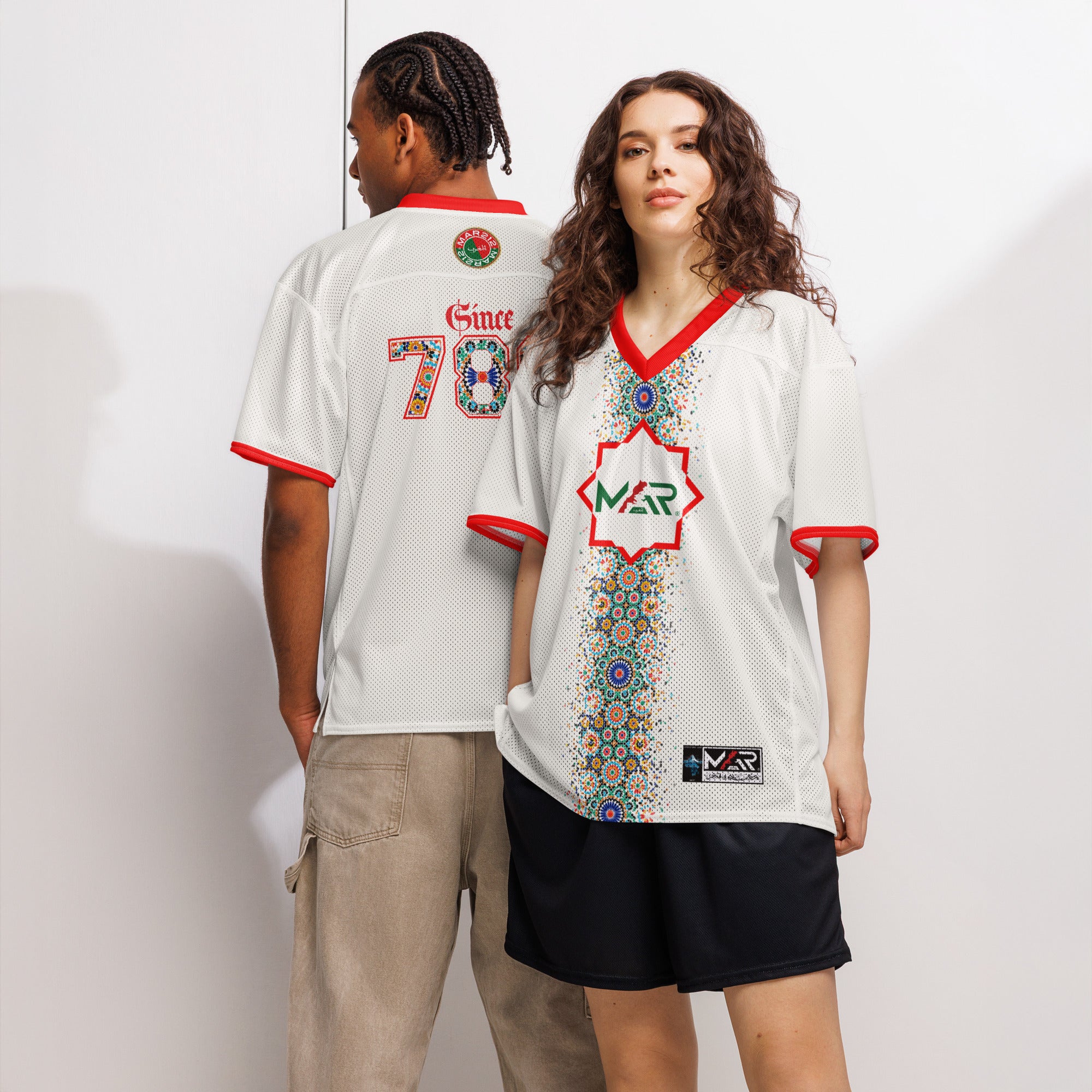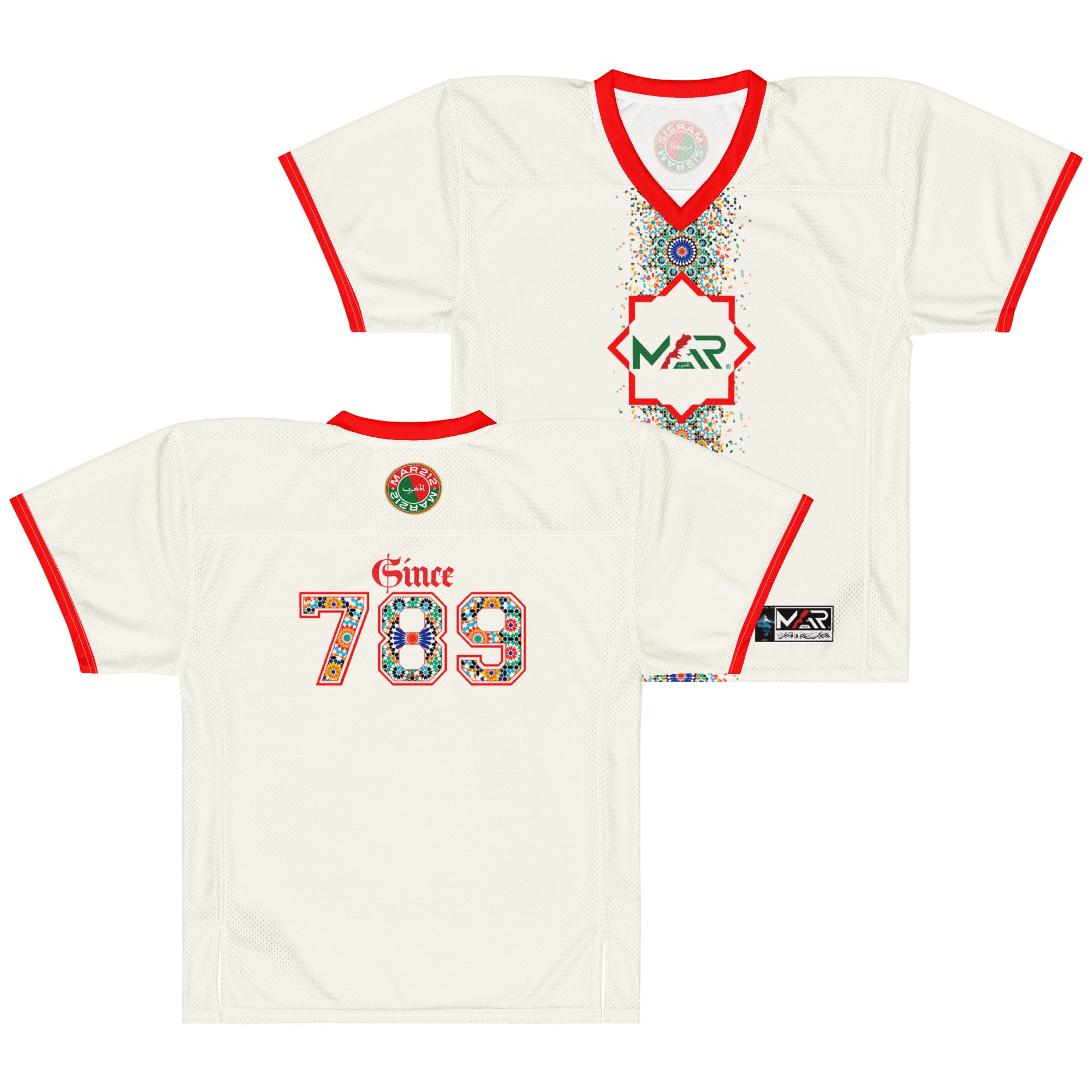 Ce maillot de football américain MARoco 789 – Édition Zellige marie l’énergie du sportswear américain à l’élégance intemporelle du zellige marocain. Sa coupe ample et respirante offre un confort parfait, tandis que le motif « Since 789 » rend hommage à plus de douze siècles d’histoire du Maroc. Une pièce premium idéale pour les amateurs de streetwear, les passionnés de sport ou tout simplement ceux qui veulent affirmer leur fierté marocaine avec style.