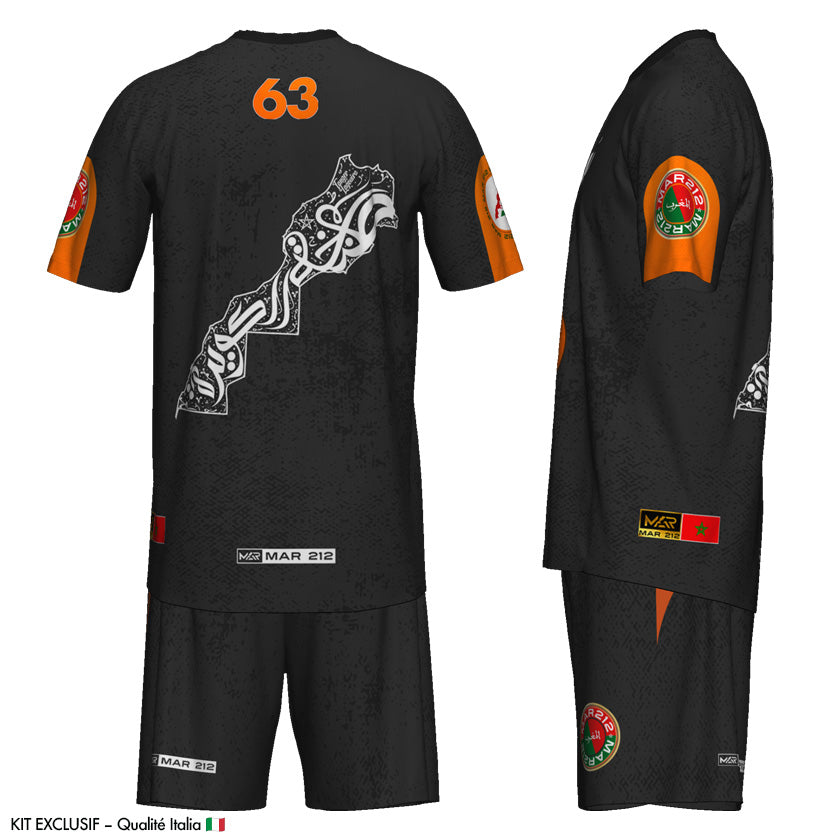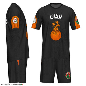 Design noir intense, orange mandarine volcanique, calligraphie arabe بركان sur la poitrine, et détails visuels puissants : chaque centimètre de ce kit raconte l’énergie brute de la région.